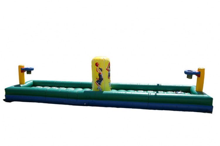 You and your competitor sprint toward the basketball hoop on each end to be the first to dunk a basket. But the catch is both opponents are connected via a bungee cord that runs through the middle! Only one can succeed. Will it be you?